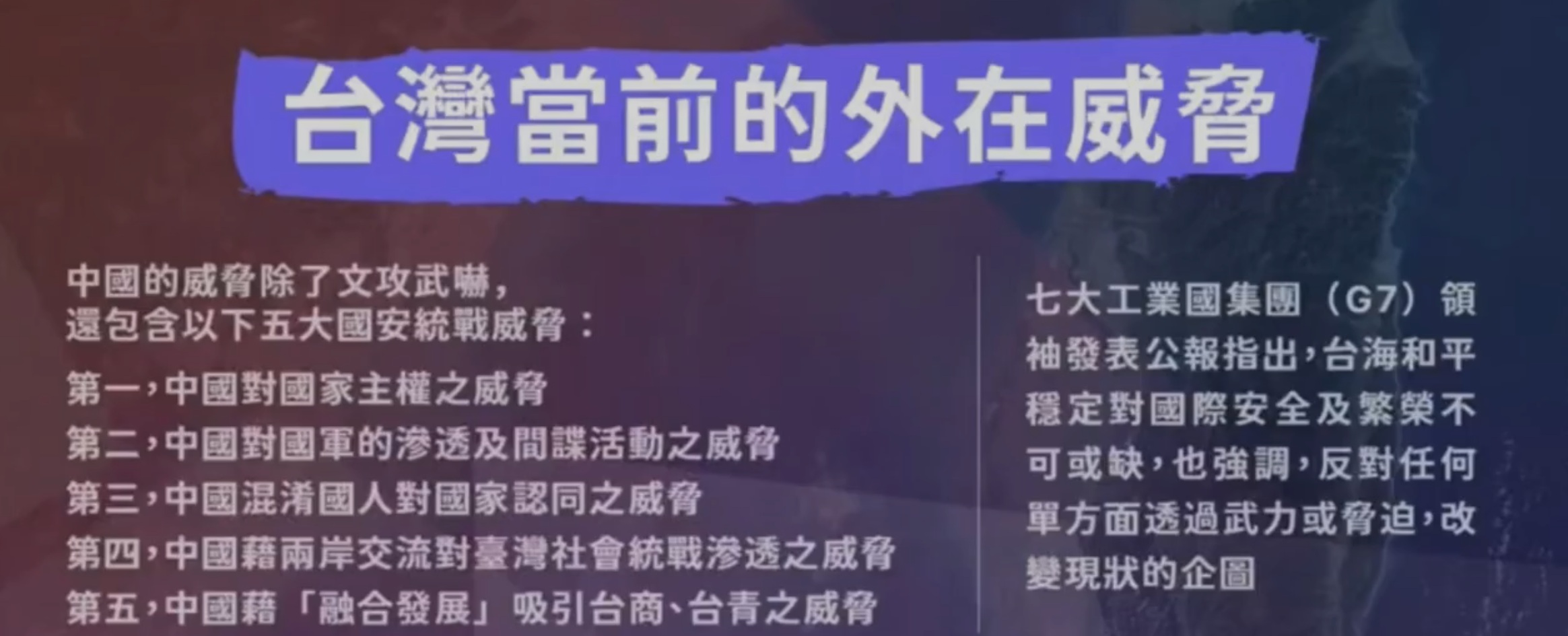 ,内容呢,讲的是台湾当前遇到的威胁,列了12345,条条指向中国,怎么说呢,我们看到了,情何以堪呢,我们心心念念的是收复台湾,人家的回复是滚蛋,这是打脸吗